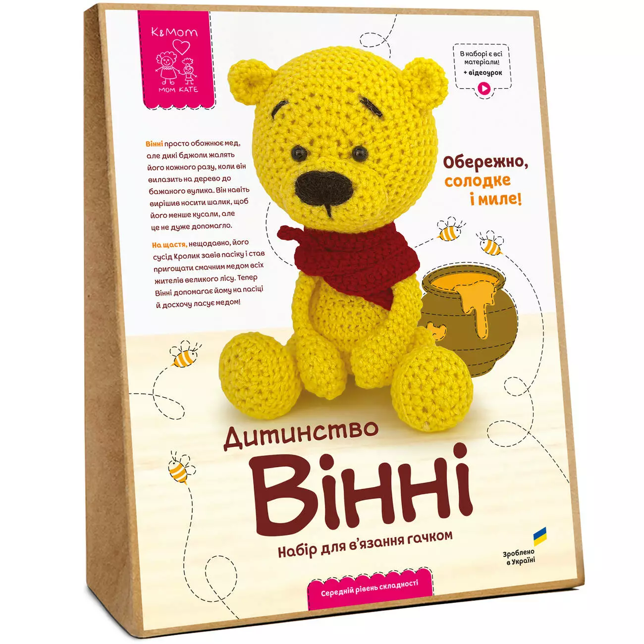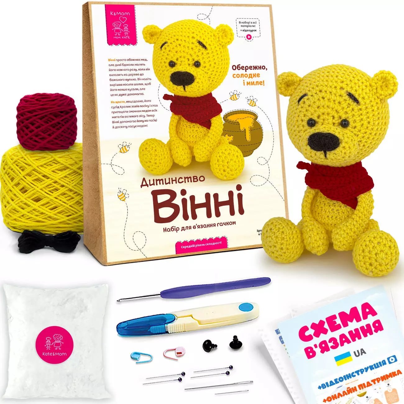 Набір для вʼязання гачком включає все необхідне, для вʼязання іграшки своїми руками: