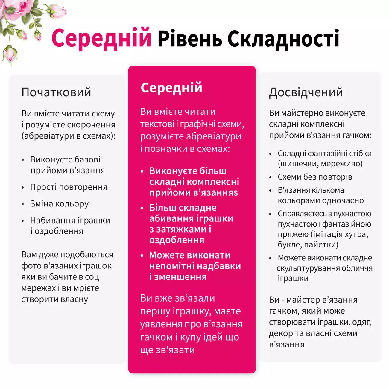 Ви вже зв’язали першу іграшку амігурумі та маєте уявлення про в’язання гачком. Розумієте, як читати схему в’язання, вмієте виконувати базові прийоми в’язання: стовпчик без накиду / сполучна петля. Знаєте принцип в’язання по колу чи по спіралі та з легкістю виконаєте збільшення або зменшення петель. Також можете вишивати гладдю.