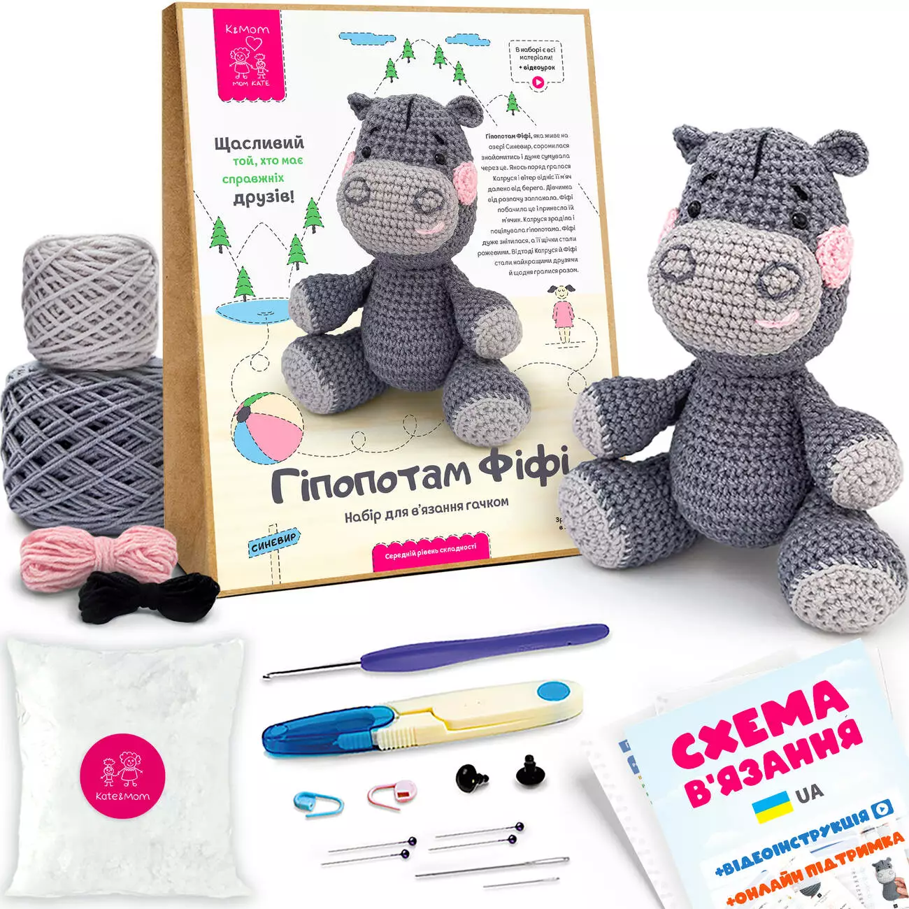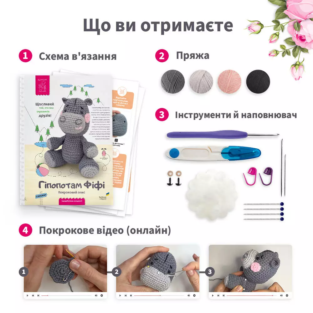 Набір для вʼязання гачком включає все необхідне, для вʼязання іграшки своїми руками: