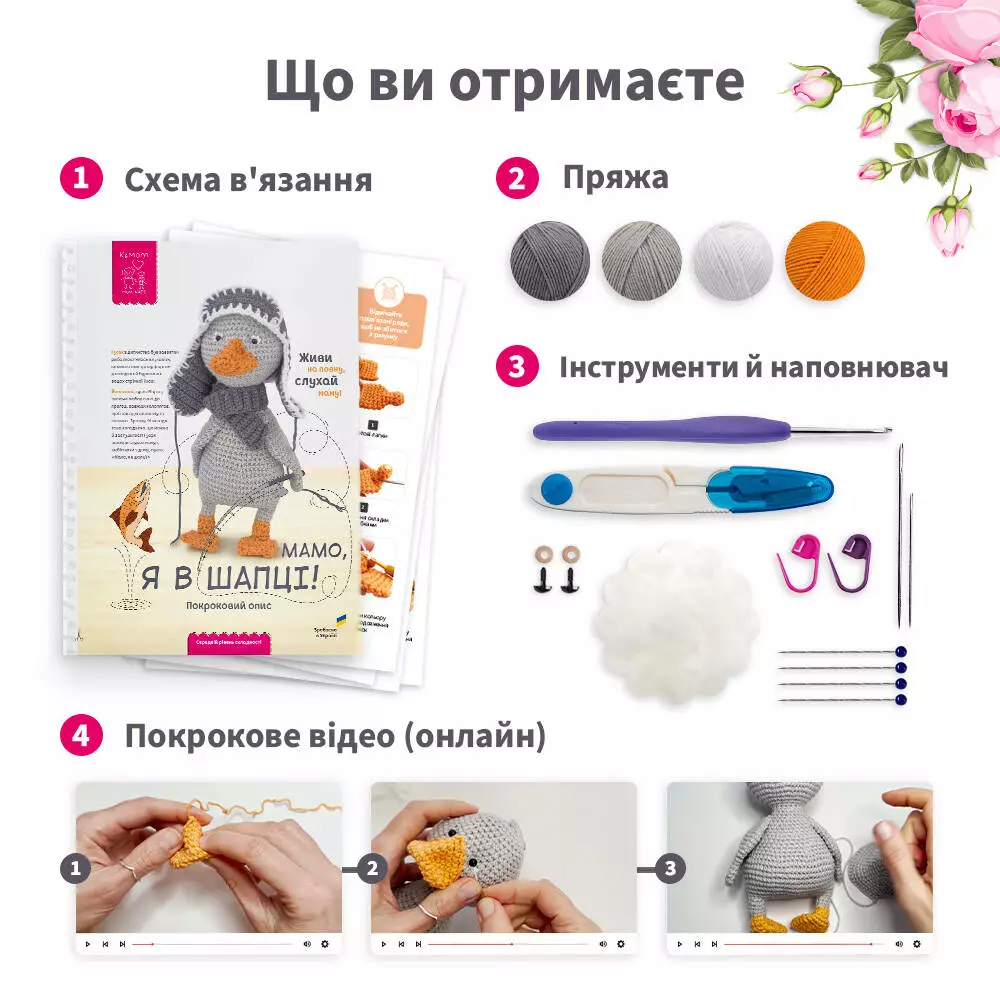 Набір для вʼязання гачком включає все необхідне, для вʼязання іграшки своїми руками: