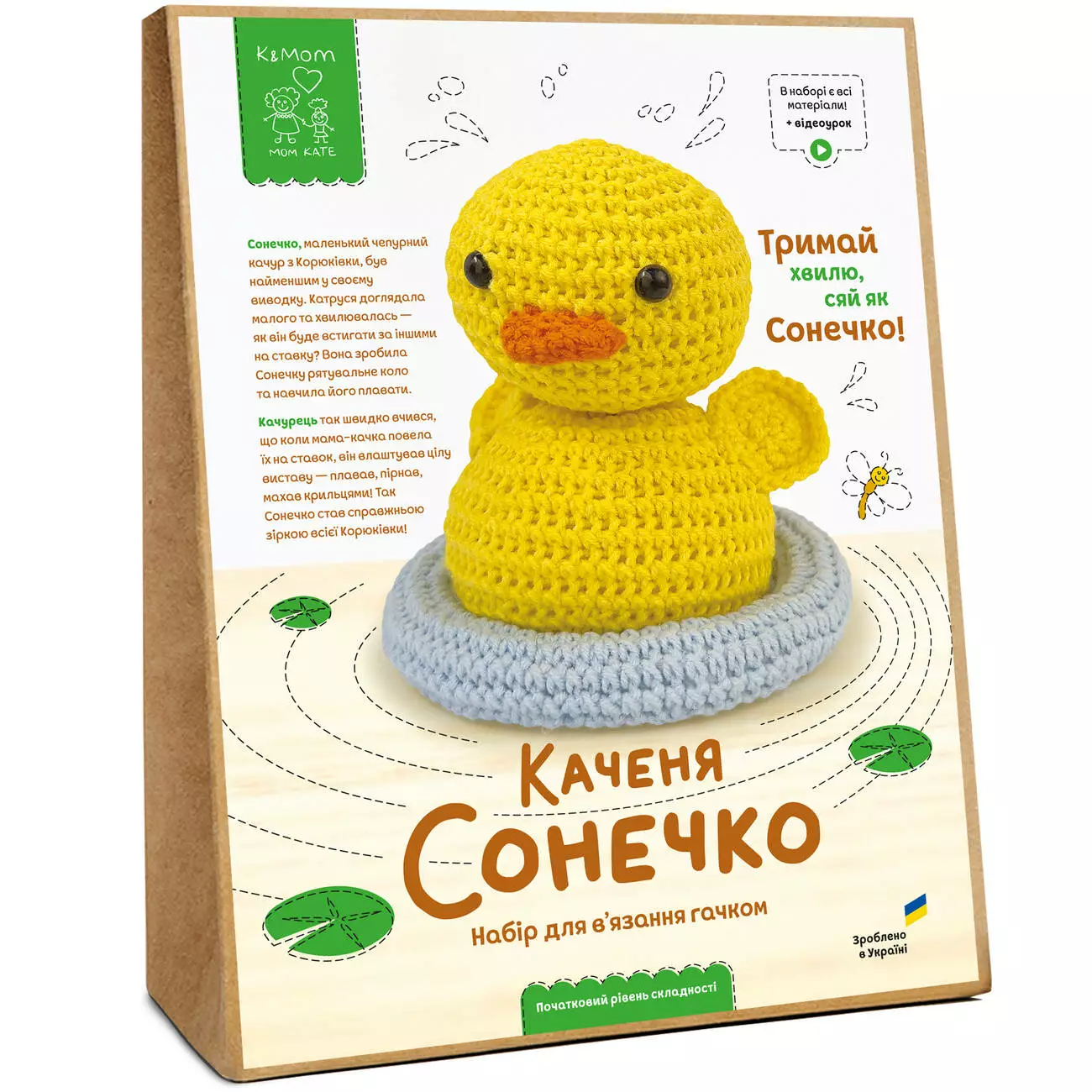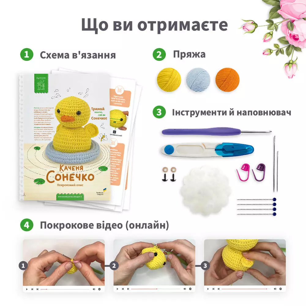 Набір для вʼязання гачком включає все необхідне, для вʼязання іграшки своїми руками: