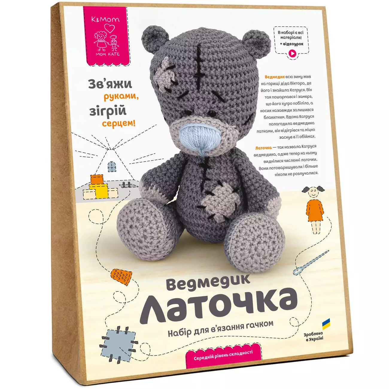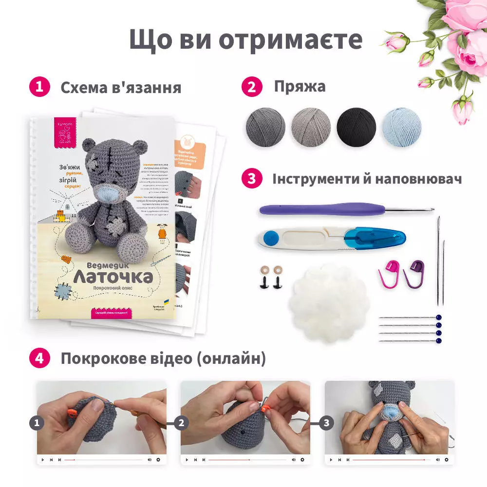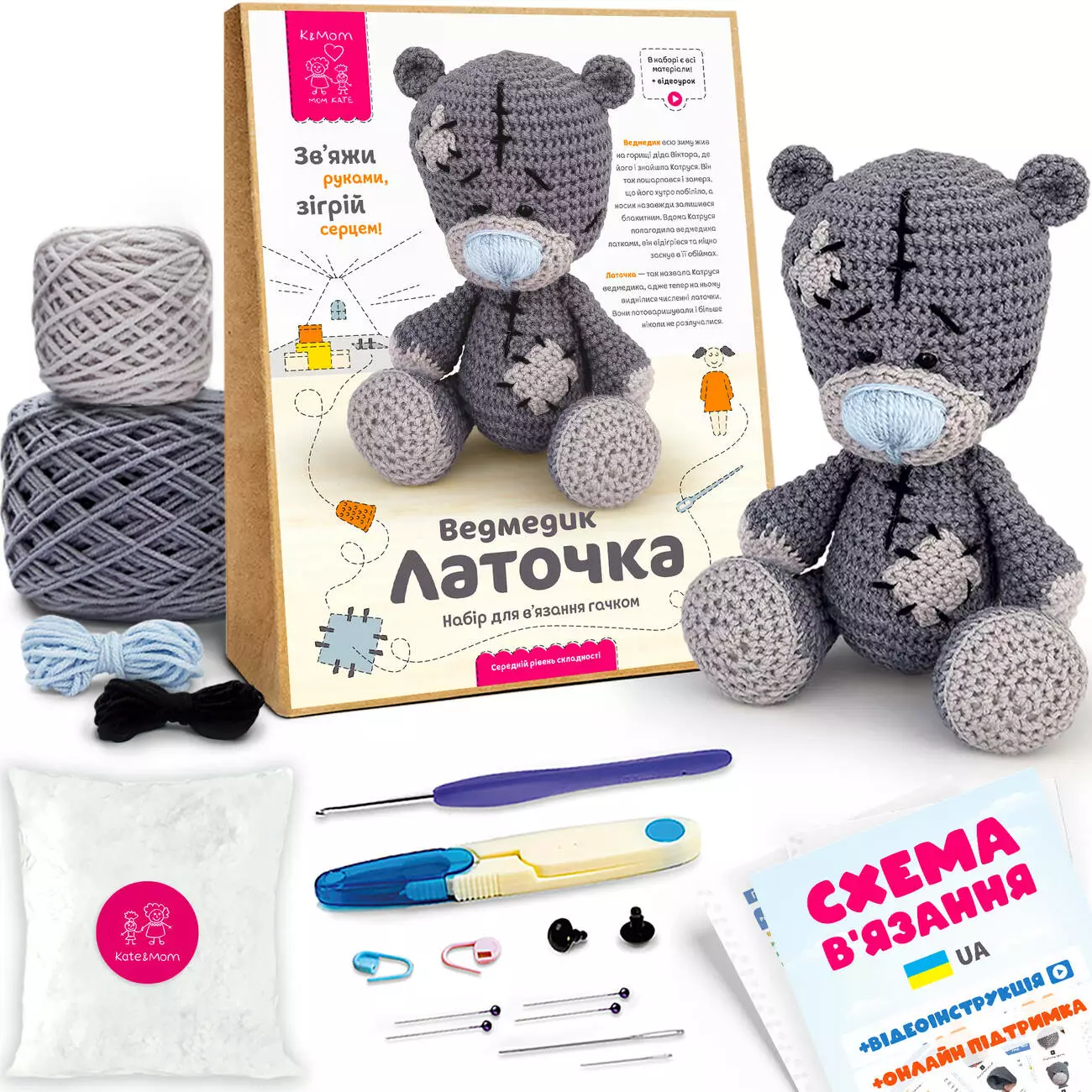 Набір для вʼязання гачком включає все необхідне, для вʼязання іграшки своїми руками: